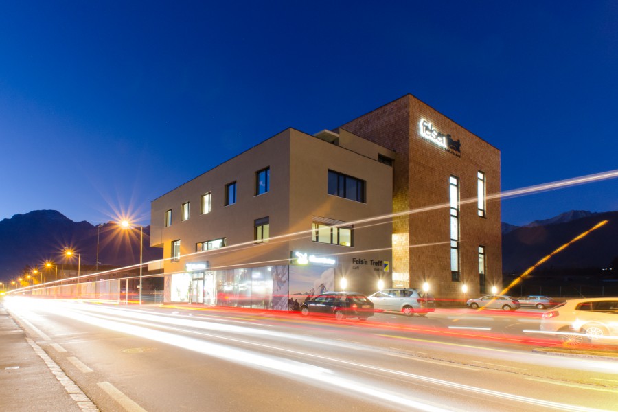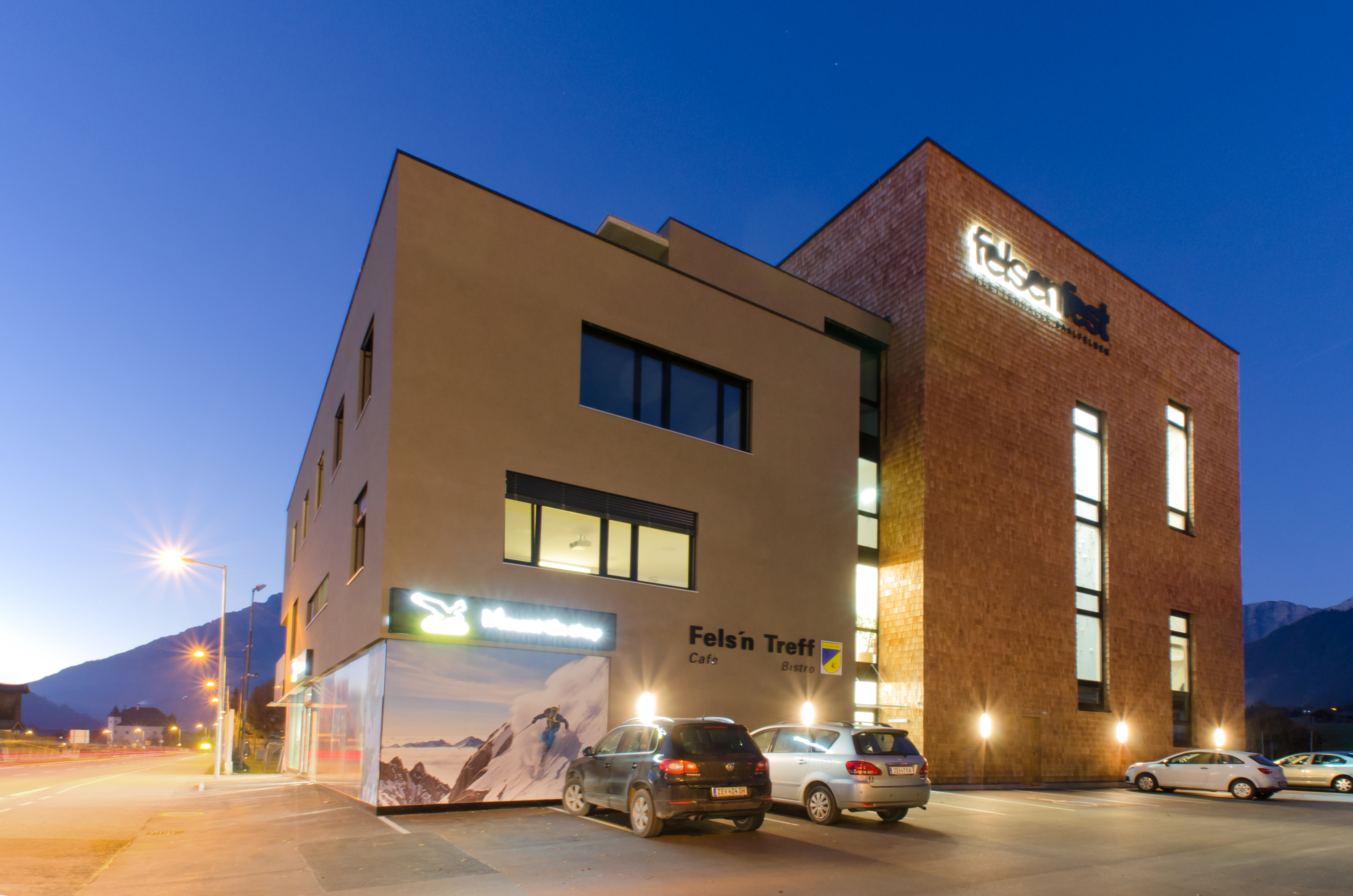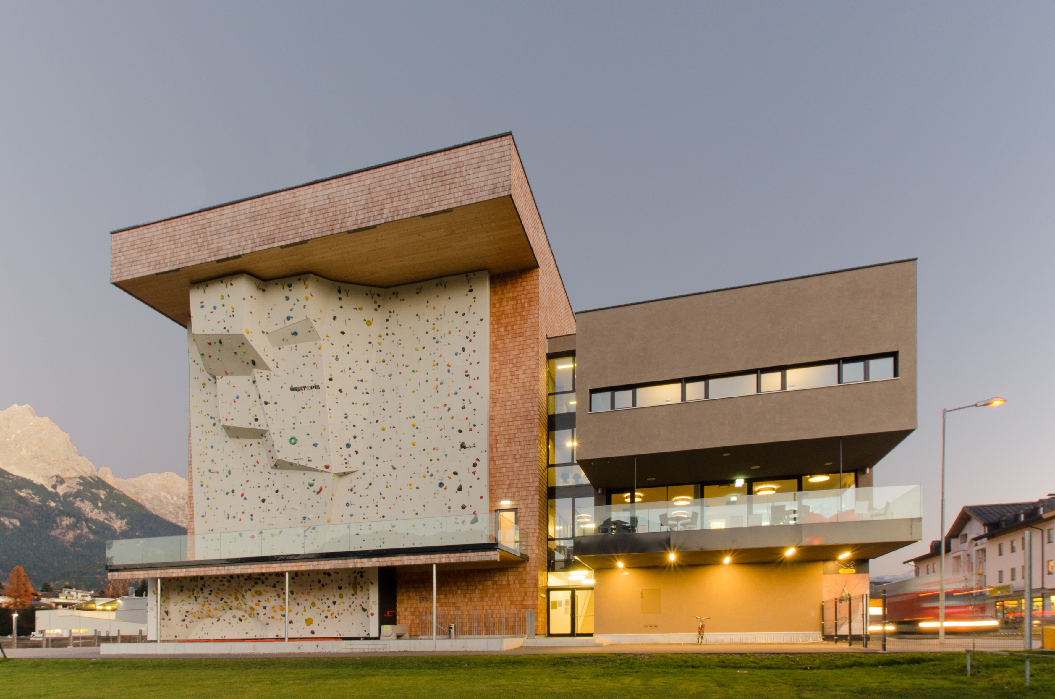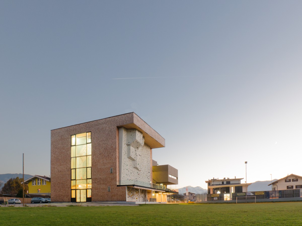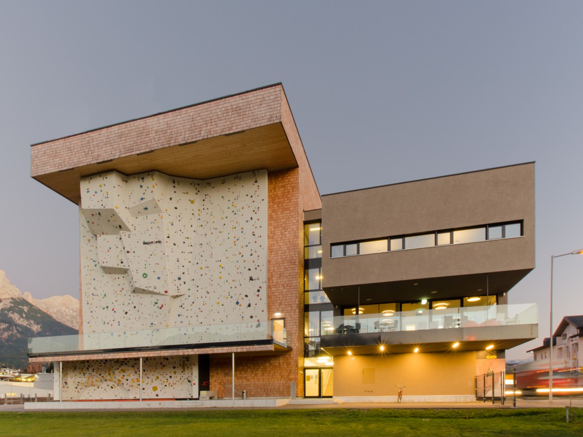 Direkt an einer der Ortseinfahrten Saalfeldens gelegen stellt die Kletterhalle ein städtebauliches Symbol dar. Die zwei Baukörper – der verschindelte Kubus der Halle und der als Kontrast verputzte Bauteil – sind durch eine Begegnungs- und Erschließungszone miteinander verbunden. Diese bietet Ein-, Aus- und Durchblicke auf Aktivitäten inner- und außerhalb des Gebäudes.
